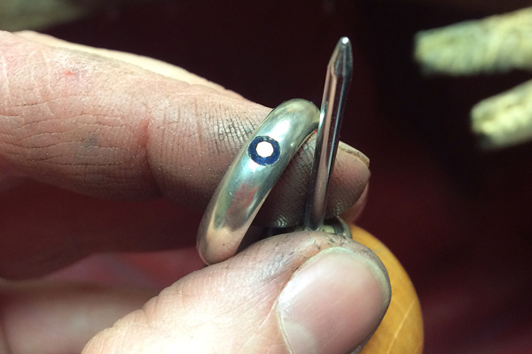Właściwie po wypolerowaniu (pastami polerskimi i wypolerowaniu w polerce rotacyjnej i magnetycznej), obrączka nadawałaby się do noszenia, ale brakuje w niej jeszcze jednego bardzo ważnego szczegółu – kamienia. W tym przypadku klientka chciała by był to „wpuszczony” w obrączkę szafir. Szafir jest kamieniem bardzo twardym i niełupliwym, dlatego idealnie się do tego nadaje. Taki rodzaj oprawy wymaga precyzji i cierpliwości. Najpierw muszę dokładnie zmierzyć kamień, oznaczyć środek obrączki i nawiercić go cieniutkim wiertłem. Potem dobieram odpowiednią średnicę otworu do kamienia.