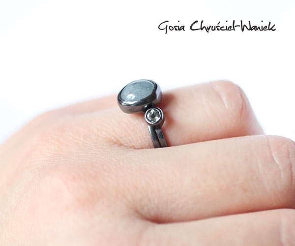 Praca na zamówienie. Pierścionki wykonane ręcznie ze srebra pr.925 i 999 i naturalnych akwamarynów (kaboszon 10x8mm i okrągły o szlifie brylantowym 4mm). Praca mocno oksydowana.