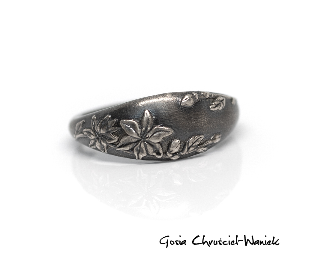 Sygnet z kolekcji inspirowanej pracami Alfonsa Muchy wykonałam w srebrze pr. 925.