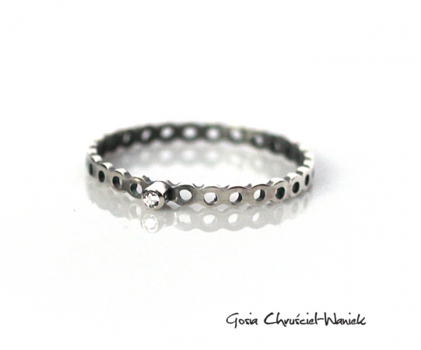 Ażurowy pierścionek wykonany ze srebra pr. 925 z białą cyrkonią o średnicy 1,5mm.