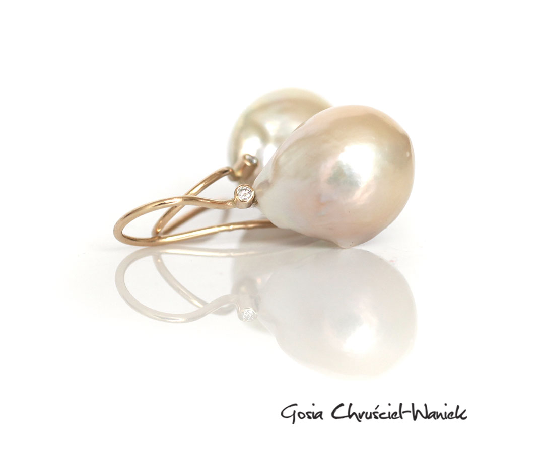 Kolczyki wykonane z naturalnych, hodowanych pereł barokowych z brylantami o średnicy 1,5mm (si, G) i złota pr. 585 (naniesione cechy probiercze).