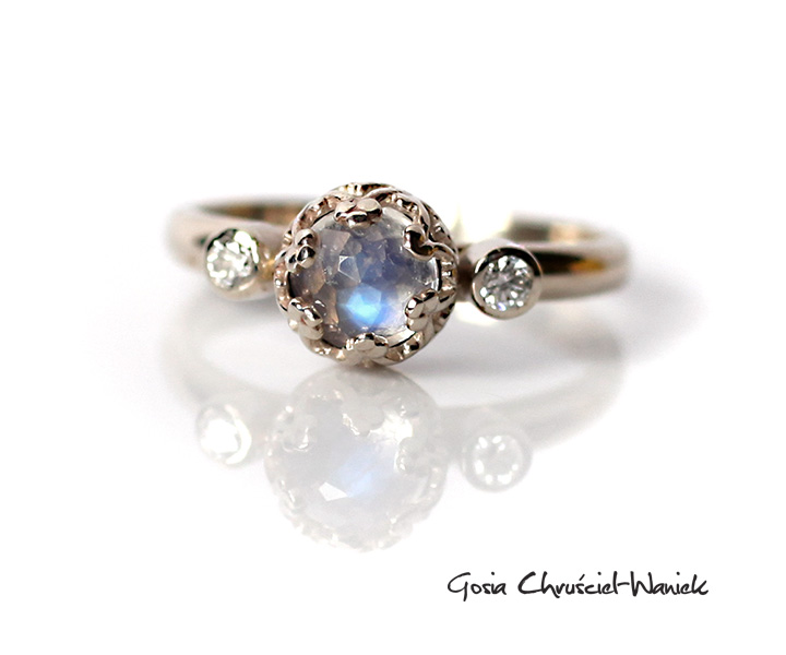 Pierścionek wykonany przeze mnie z białego złota pr. 585 z wysokiej jakości kamieniem księżycowym o szlifie rozetowym i dwoma brylantami o średnicy ok 2,1mm i łącznej masie 0,08ct.