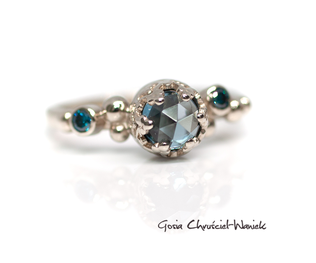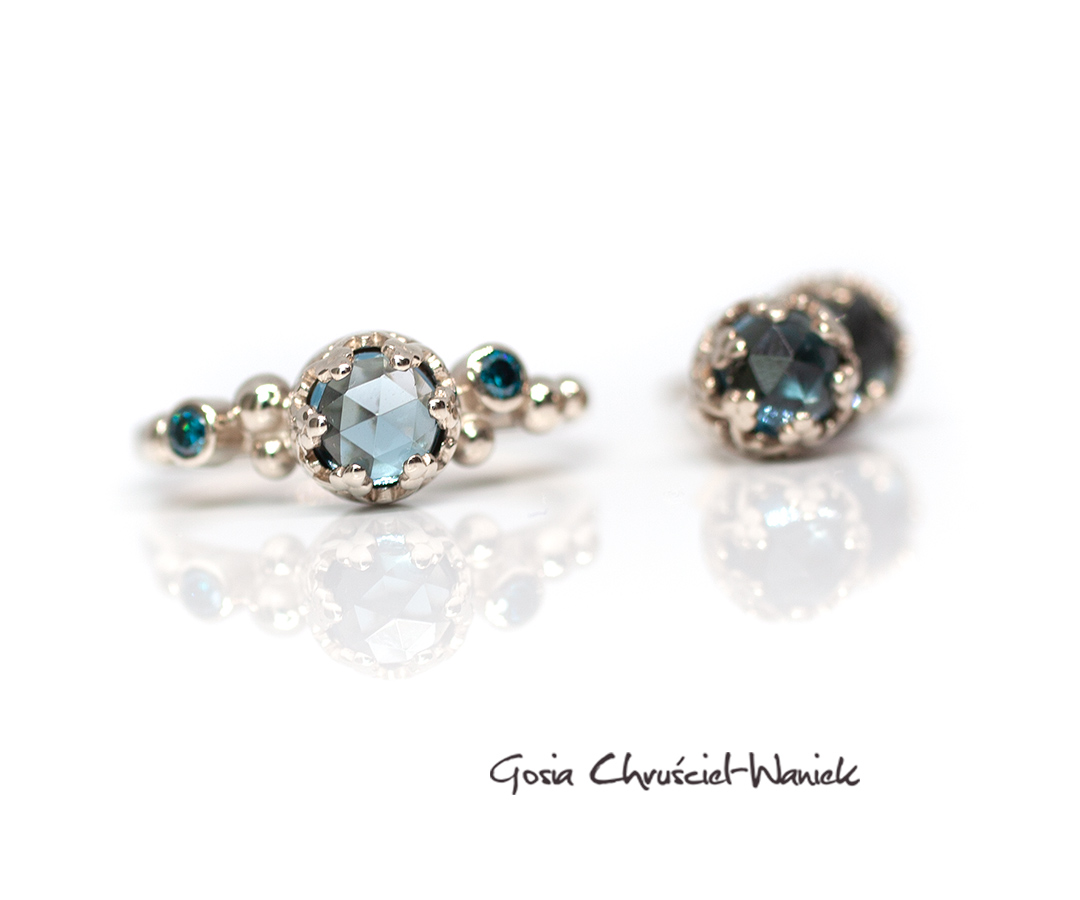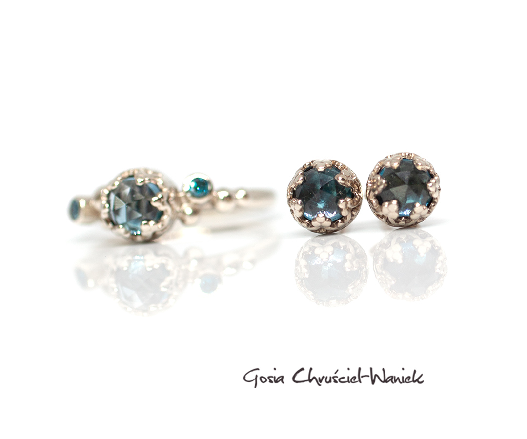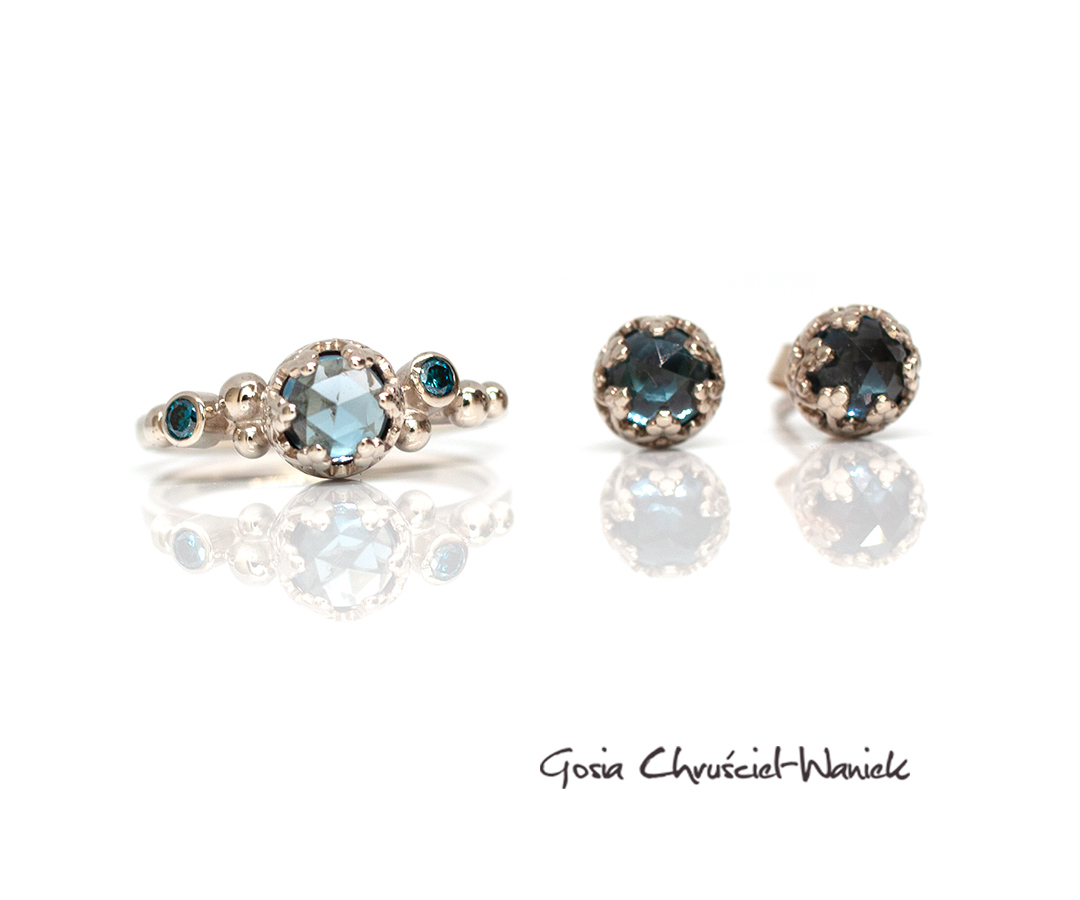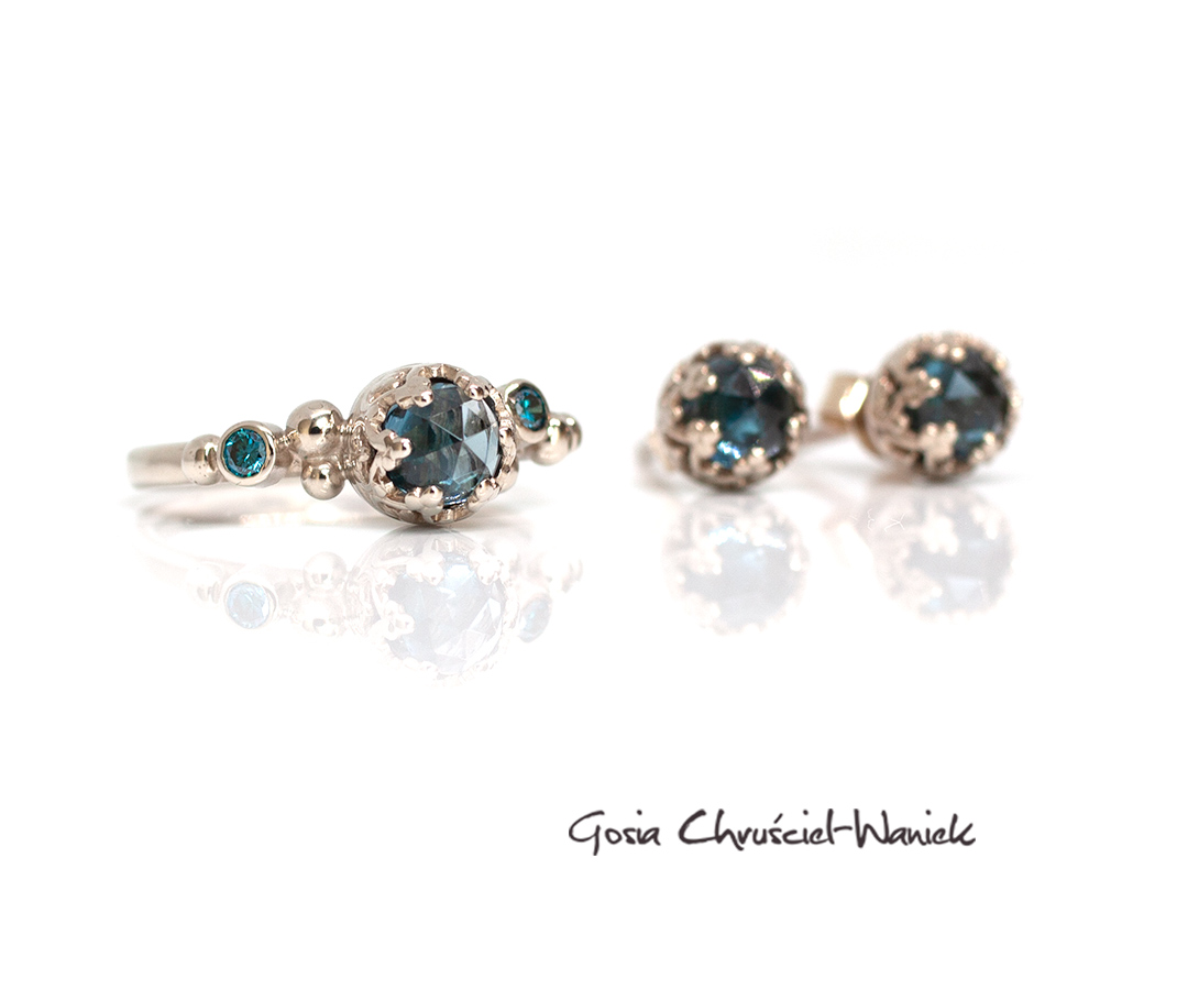Komplet wykonany z białego złota pr. 585 z topazami London Blue o średnicy 5mm.