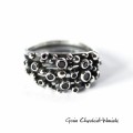 Pierścionek wykonany ze srebra pr. 925 i 999 oraz czarnych cyrkonii o średnicy 2,5mm, 2mm i 1,5mm. Rozmiar jubilerski 17. Praca oksydowana i polerowana.