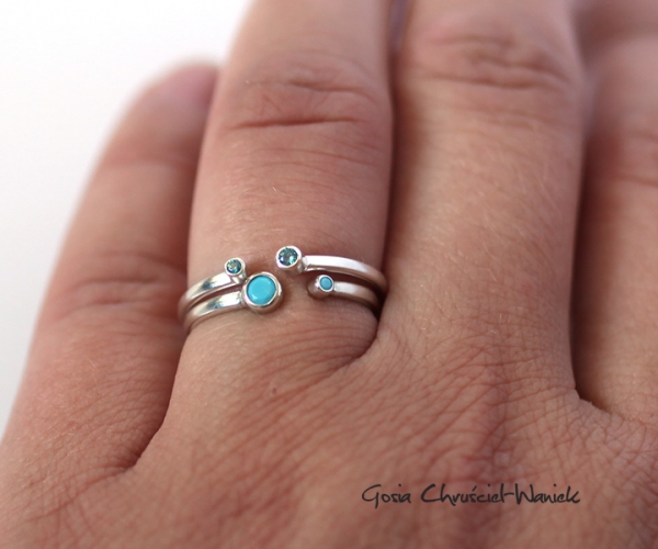 Pierścionek wykonany ze srebra pr. 925 z cyrkoniami w kolorze Topaz Blue o średnicy 1,5mm i 2mm.