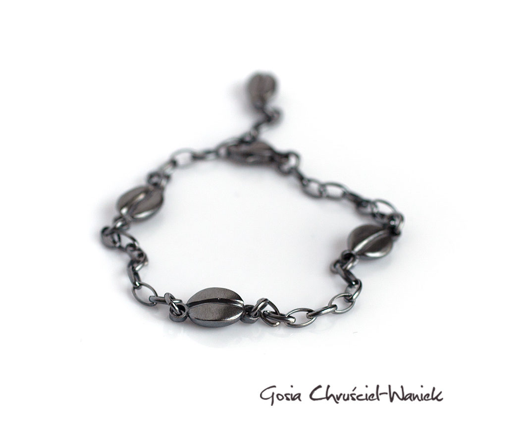 Bransoleta wykonana ze srebra pr. 925 z ręcznie rzeźbionymi ziarenkami kawy.