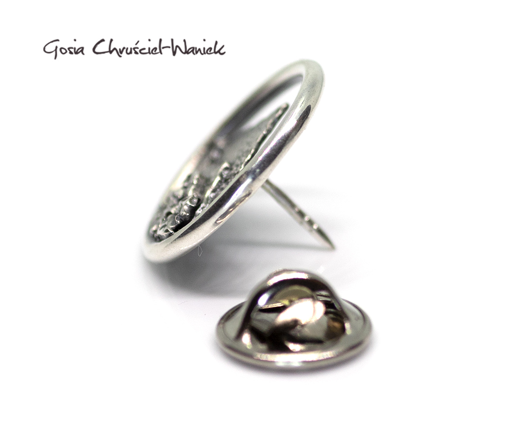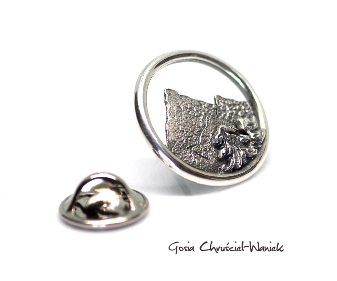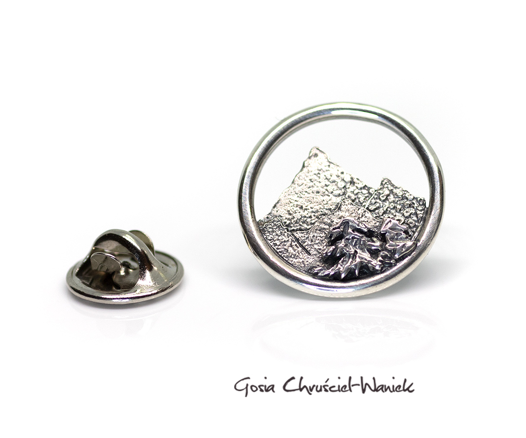 Broszka / Pin wykonana ze srebra pr. 925 (brosza i sztyft) oraz ze stali (zapięcie). Broszka przedstawia górski krajobraz z drzewem. Dla wielbicieli podróży, nauty.