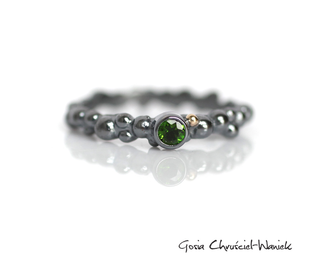 Pierścionek wykonany ze srebra pr. 925, z chromdiopsydem i złotą kuleczką.