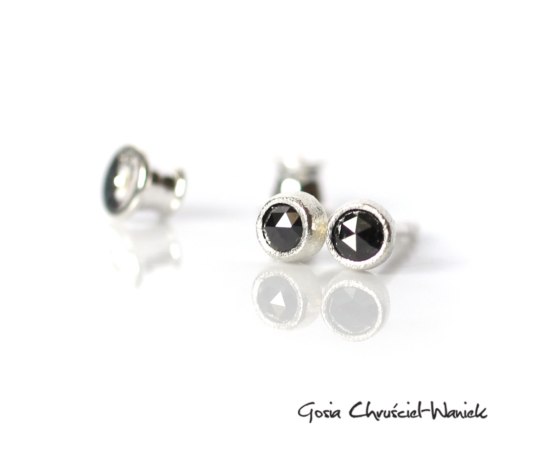 Kolczyki sztyfty wykonane ze srebra pr. 925 z czarnymi diamentami o szlifie rozetowym o średnicy 3,5mm.