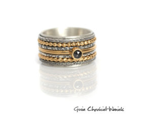 Obrączka wykonana ze srebra pr. 925, ze złotą falą (żółte złoto pr. 585) i czarnym brylantem.Obrączka z mocną fakturą i poszarpanymi brzegami.