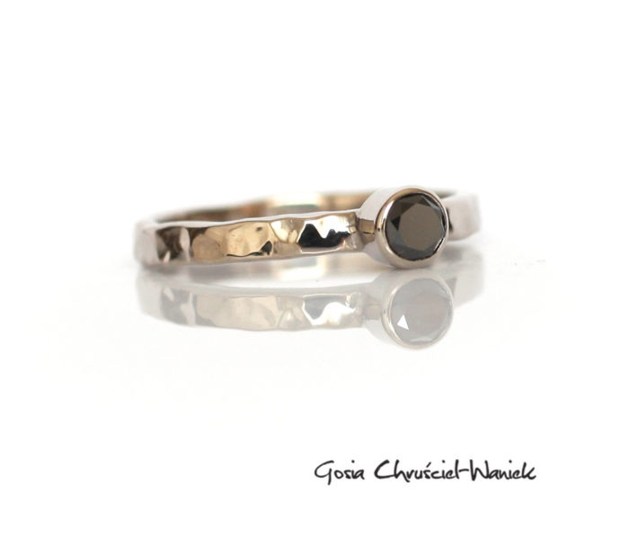 Pierścionek wykonany na zamówienie z białego palladowego złota. Główną ozdobą kamienia jest 4mm czarny diament o masie 0,33ct.