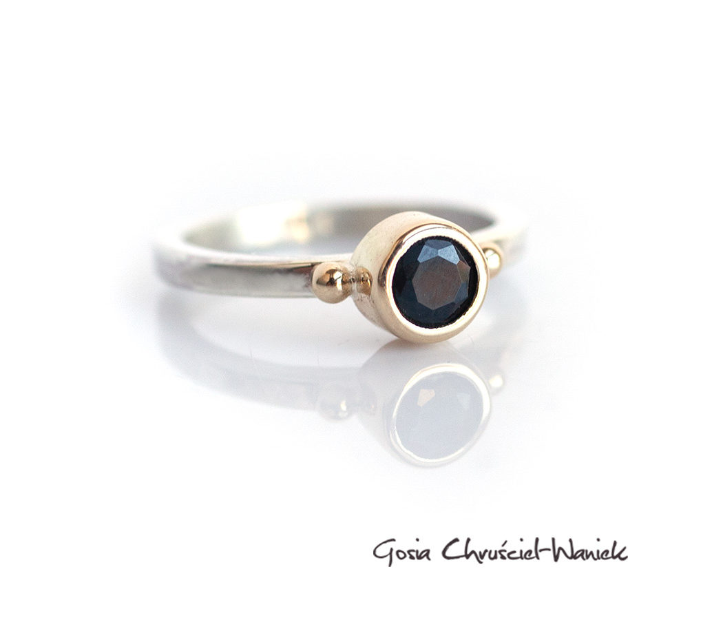Pierścionek wykonany na zamówienie ze srebra pr. 925 i złota pr. 585. Efektowny czarny szafir został oprawiony w złoto.