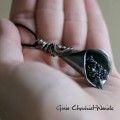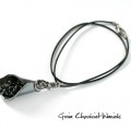 Praca na zamówienie. Naszyjnik wykonany ze srebra pr. 925, czarnych spineli mistycznych, fasetowanych hematytów i naturalnych, słodkowodnych perełek oraz naturalnego rzemienia. Wisior ma formę kalii z kaskadą fasetowanych oponek i kul naturalnych kamieni pięknie odbijających światło oraz perełek. Srebro zostało mocno zoksydowane na grafitowy kolor, miejscami przetarte i wypolerowane. Długość całkowita wisiora ok 6cm.