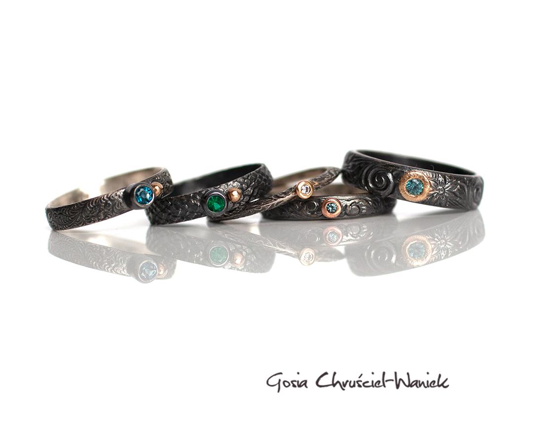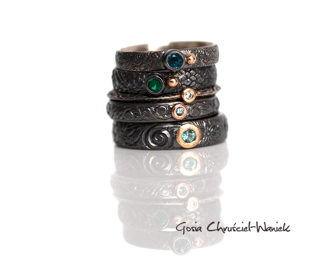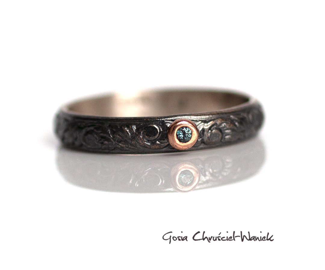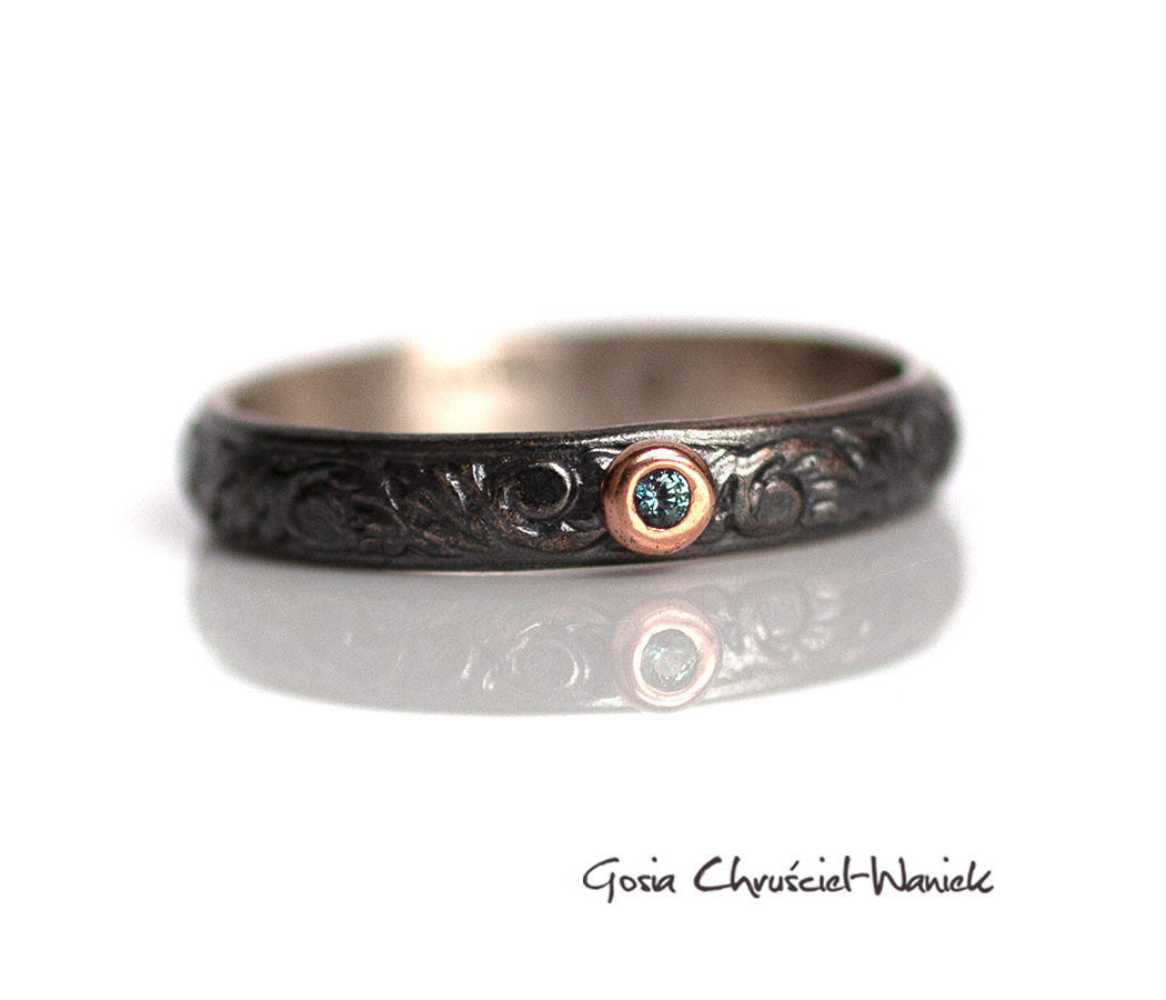 Pierścionek wykonany ze srebra pr. 925, ze złotem pr. 585 (oprawka) z hodowanym aleksandrytem o średnicy 2mm.