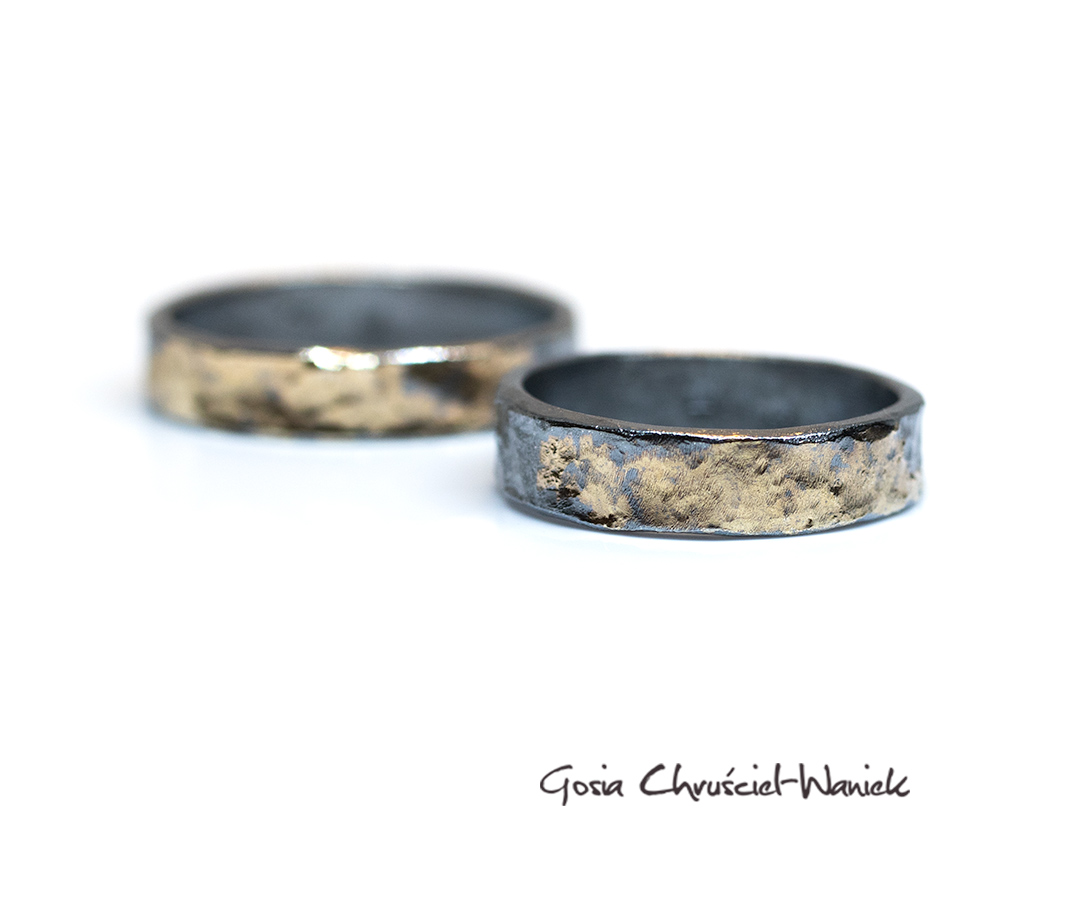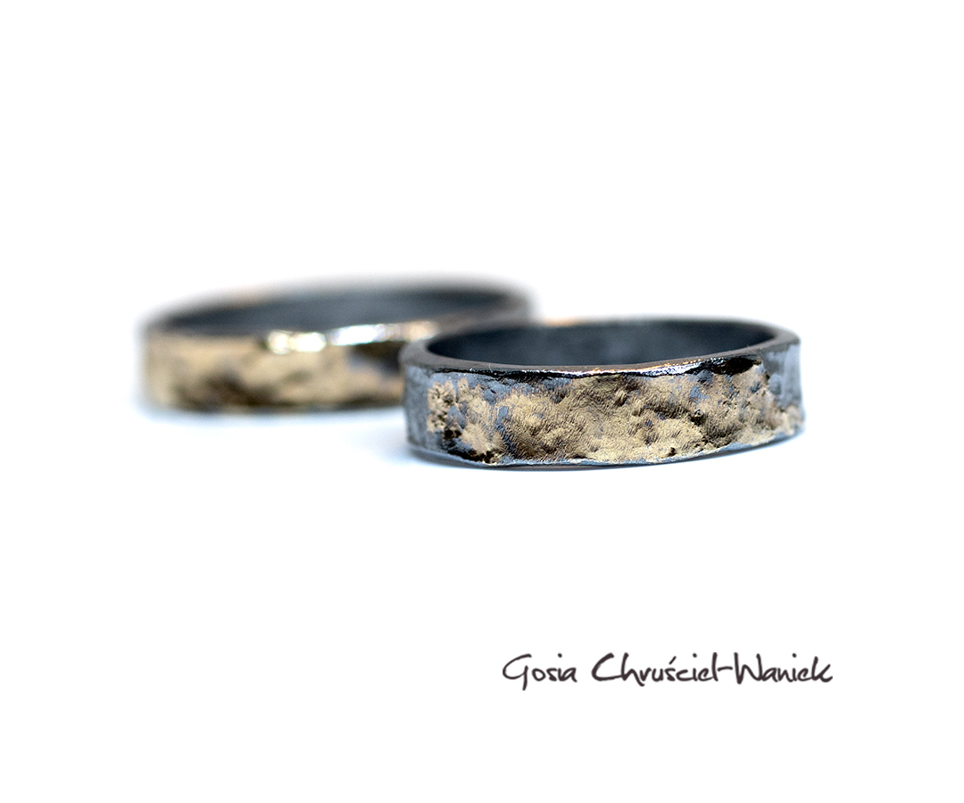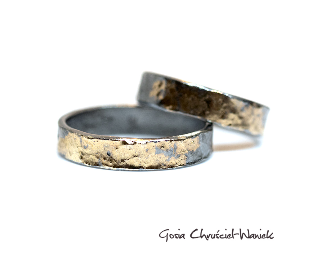 Obrączki wykonane ręcznie ze srebra pr. 925, zdobione żółtym złotem pr. 585