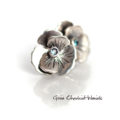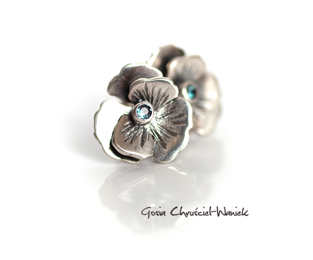 Kolczyki sztyfty z motywem kwiatów – fiołków wysadzanych hodowanymi aleksandrytami.