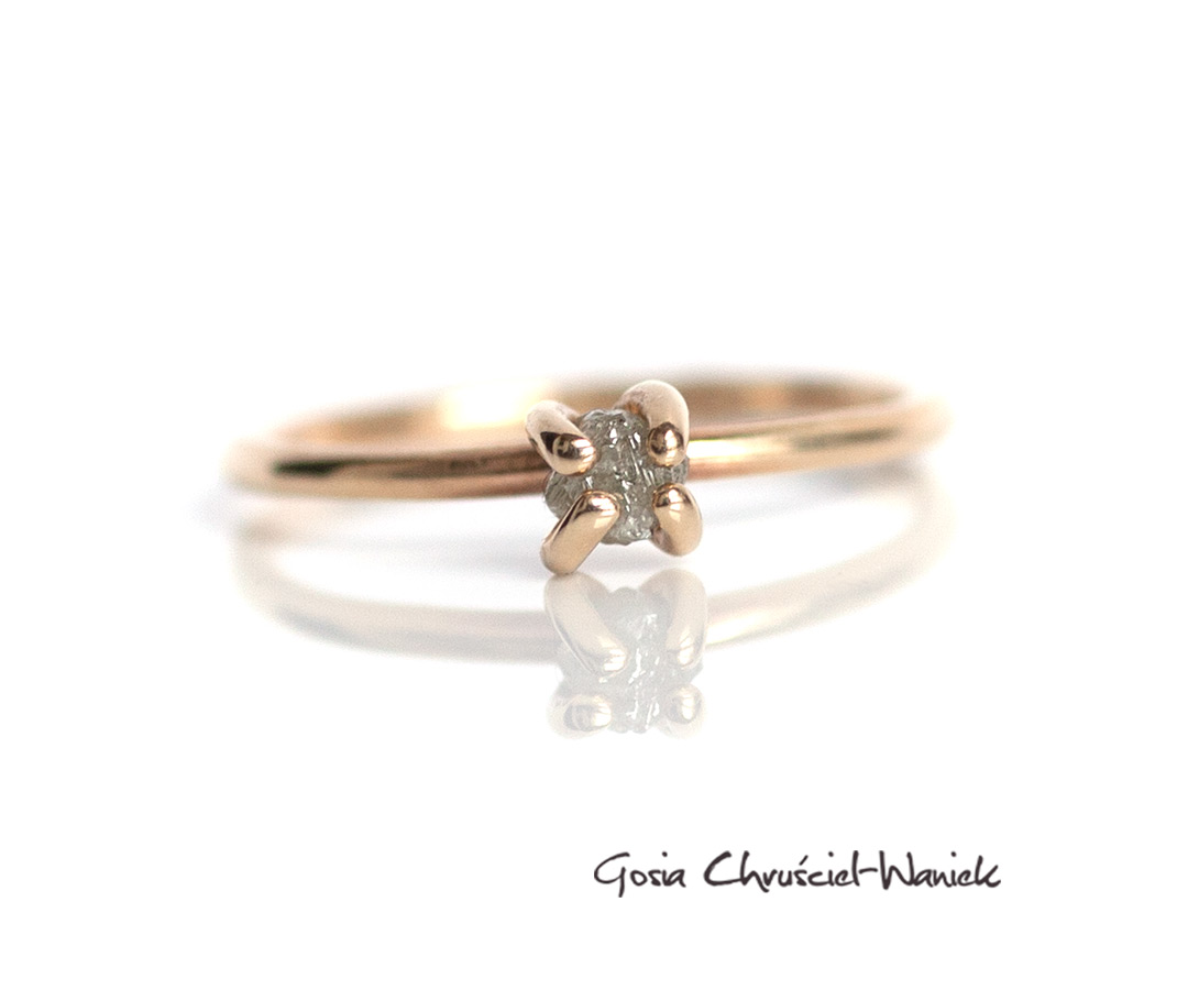 Pierścionek wykonany na zamówienie ze złota pr. 585 z biało-srebrzystym, surowym diamentem.