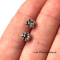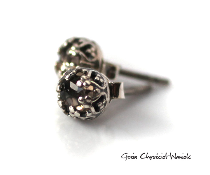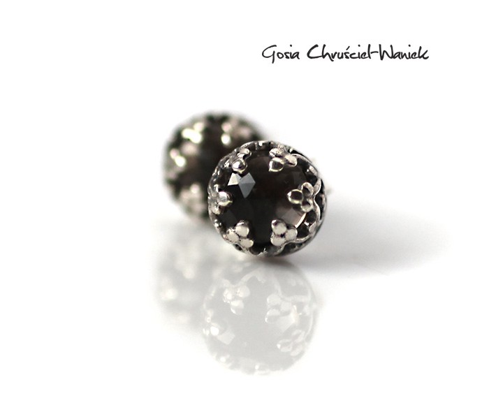 Delikatne, ażurowe kolczyki sztyfty z kwarcami dymnymi o średnicy 5mm. Kamienie o szlifie rozetowym