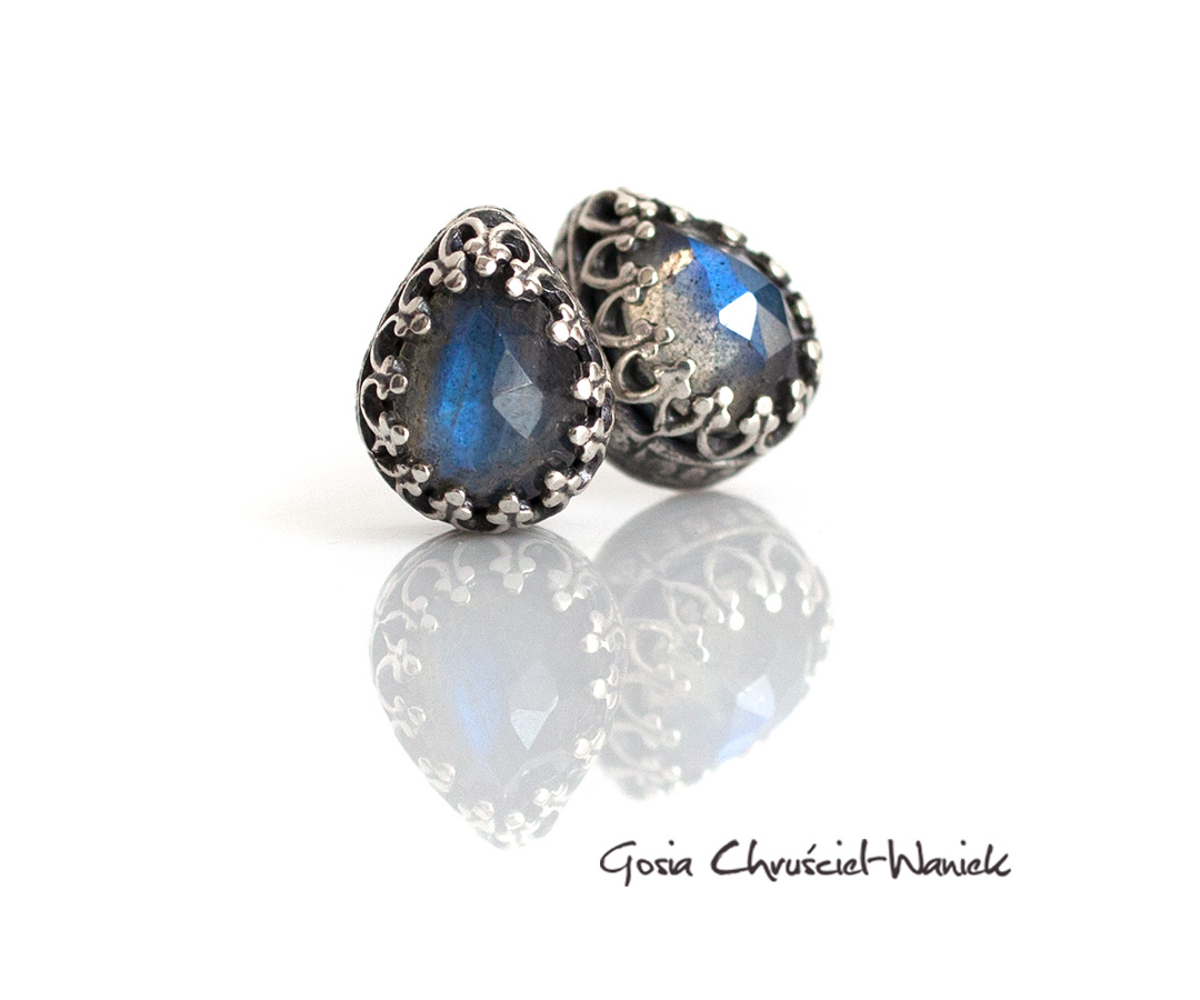 KOlczyki sztyfty wykonane ze srebra pr. 925, z pięknymi rozetami labradorytów opalizujących na niebiesko.
