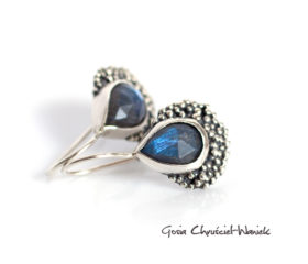 Piękne 6mm rozety labradorytów w ażurowym srebrze. Kamienie mają opalizację różowo-fioletową.