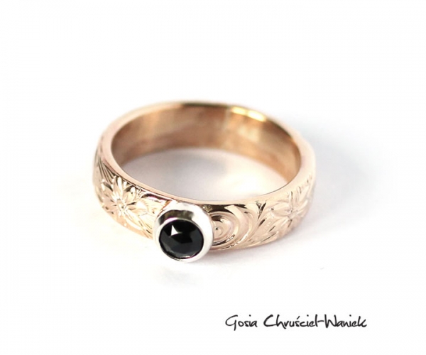 Pierścionek wykonany ze srebra pr. 999, ze stopu gold-filled oraz melanitu (czarna odmiana granatu) o szlifie rozetowym (5mm). Rozmiar 16-16,5.