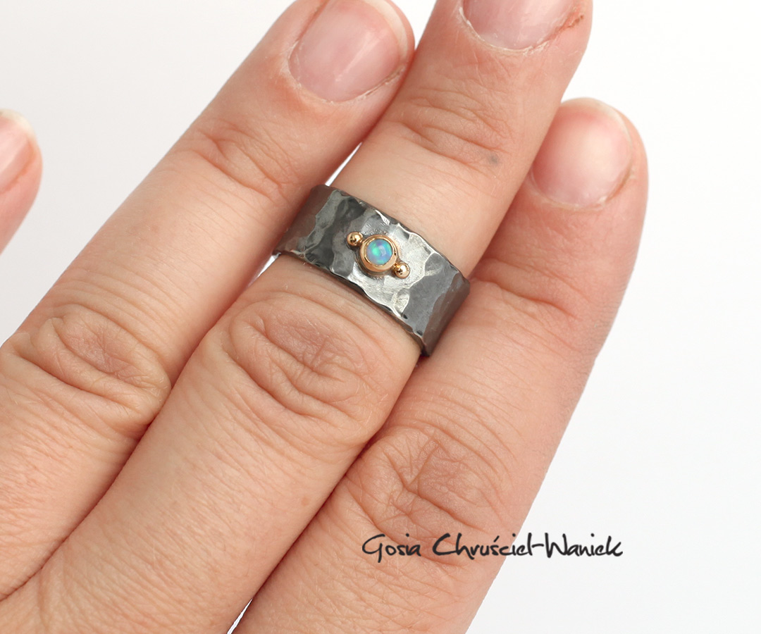 Obrączka wykonana ze srebra pr. 925, młotkowana. Obrączka zdobiona złotem pr. 585 (oprawka kamienia i kuleczki) oraz opalem o średnicy 3mm.