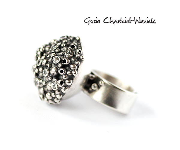 Zakochałam się w złotym pierścionku Cartiera. Oto egzemplarz, który powstał pod jego wpływem. Pierścionek wykonany ręcznie ze srebra pr. 930, 999 oraz białych cyrkonii o średnicy 2mm. Bardzo procochłonny projekt. Pierścionek jest bardzo okazały, ale wygodny w noszeniu. Wysokość całkowita korony ok 1,9cm. ¦rednica ok 2,4mm Rozmiar uniwersalny, regulowany w zakresie ok 12-20. Waga ok 20,2g.