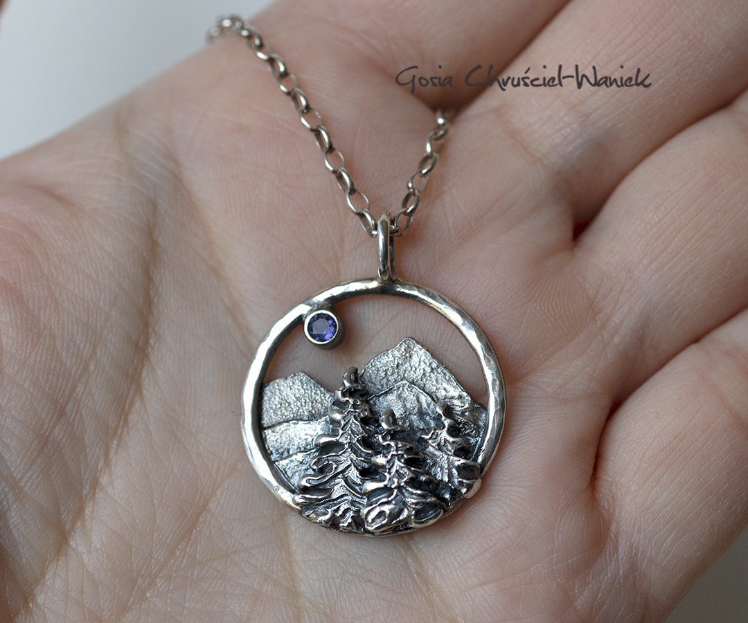 Naszyjnik wykonany ze srebra pr. 925 i ozdobiony iolitem o średnicy 3mm.