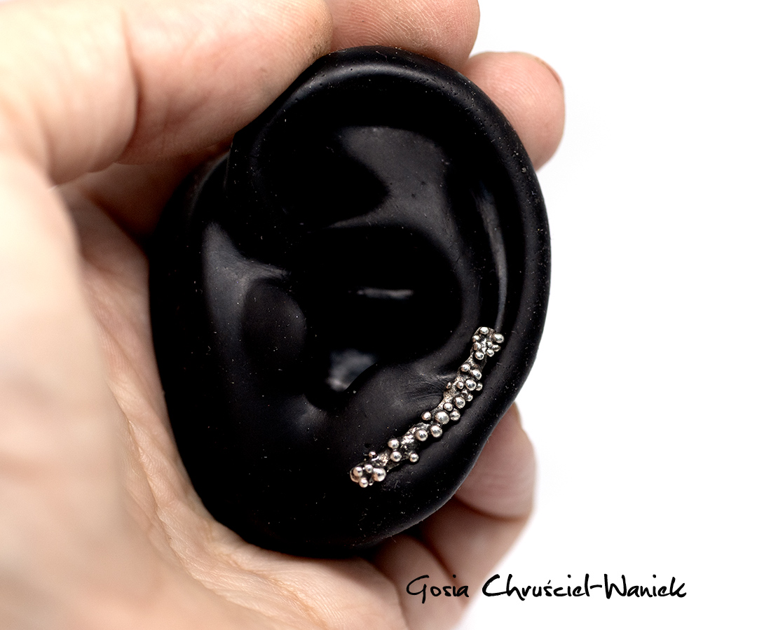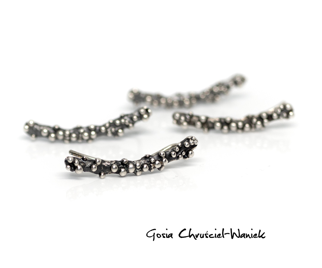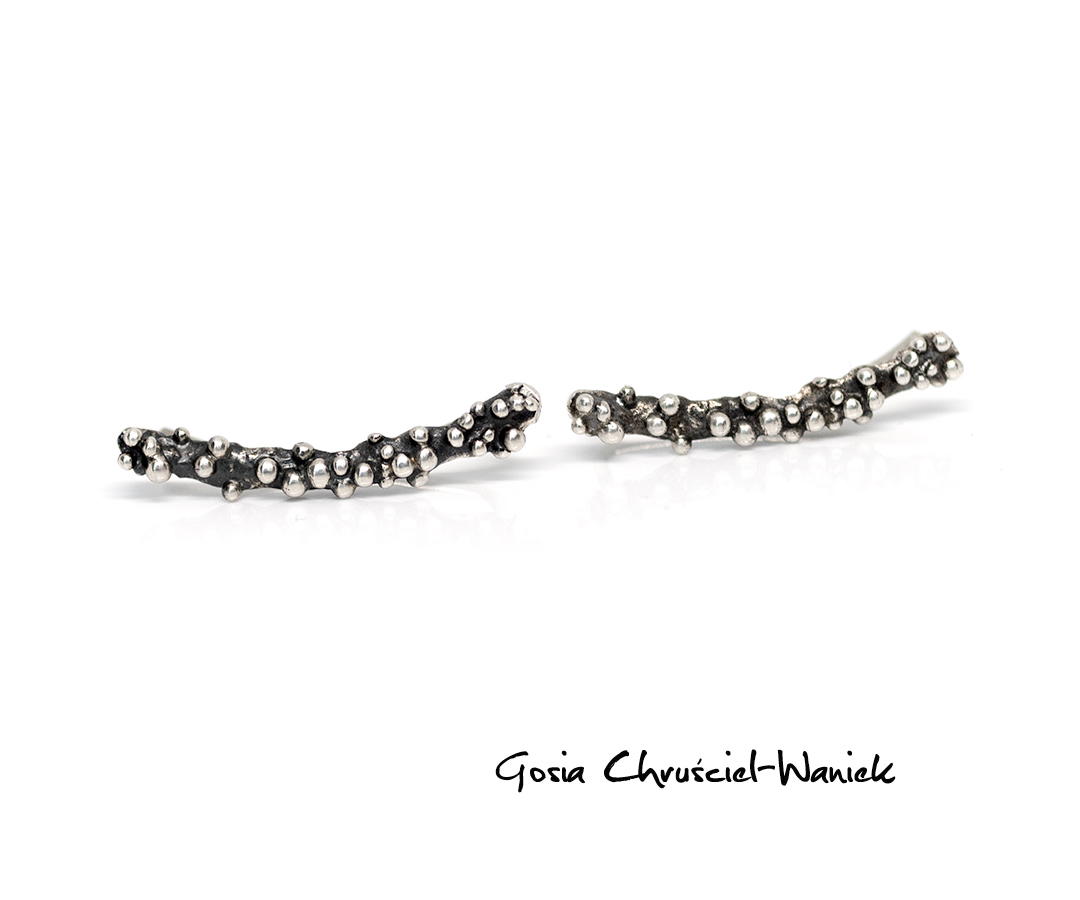Nausznice/kolczyki wykonane ze srebra pr. 925, oksydowane na grafitowy kolor i przetarte.