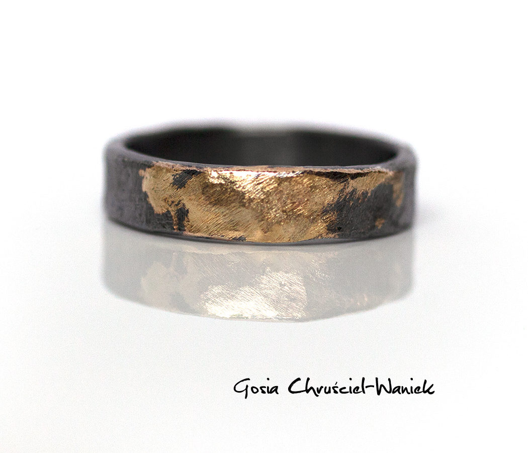 Obrączka wykonana na zamówienie ze srebra r. 925, zdobiona złotem pr. 585. Szerokości obrączki ok 5mm, rozmiar jubilerski 21.