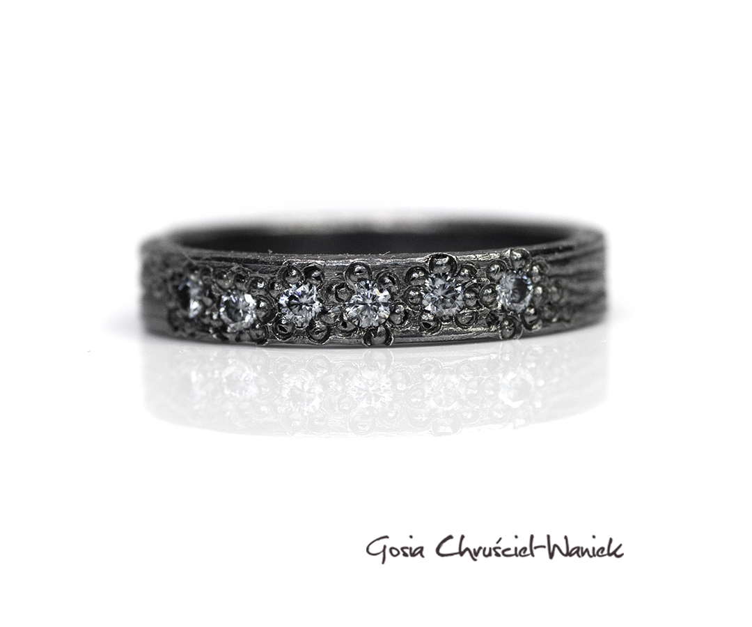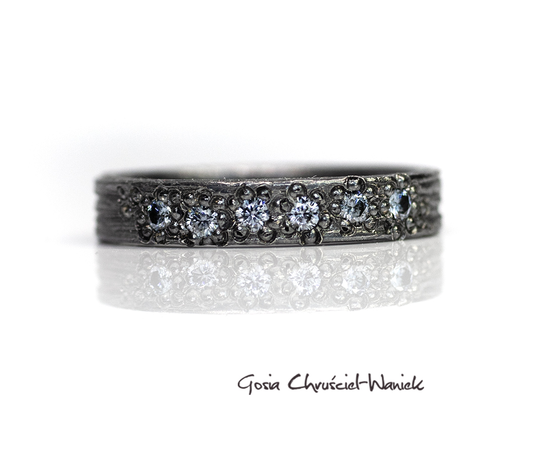Obrączka wykonana ze srebra pr. 925 została ozdobioona przeze mnie 6 szarymi moissanitami i fakturą.