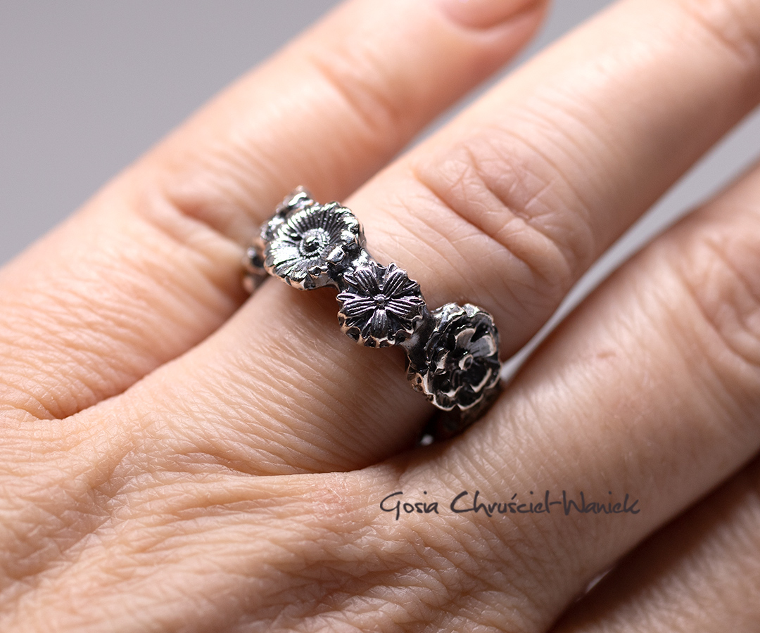 Obrączka z kolekcji Meadow została wykonana ze srebra pr. 925. Szerokość obrączki ok 6-9mm.