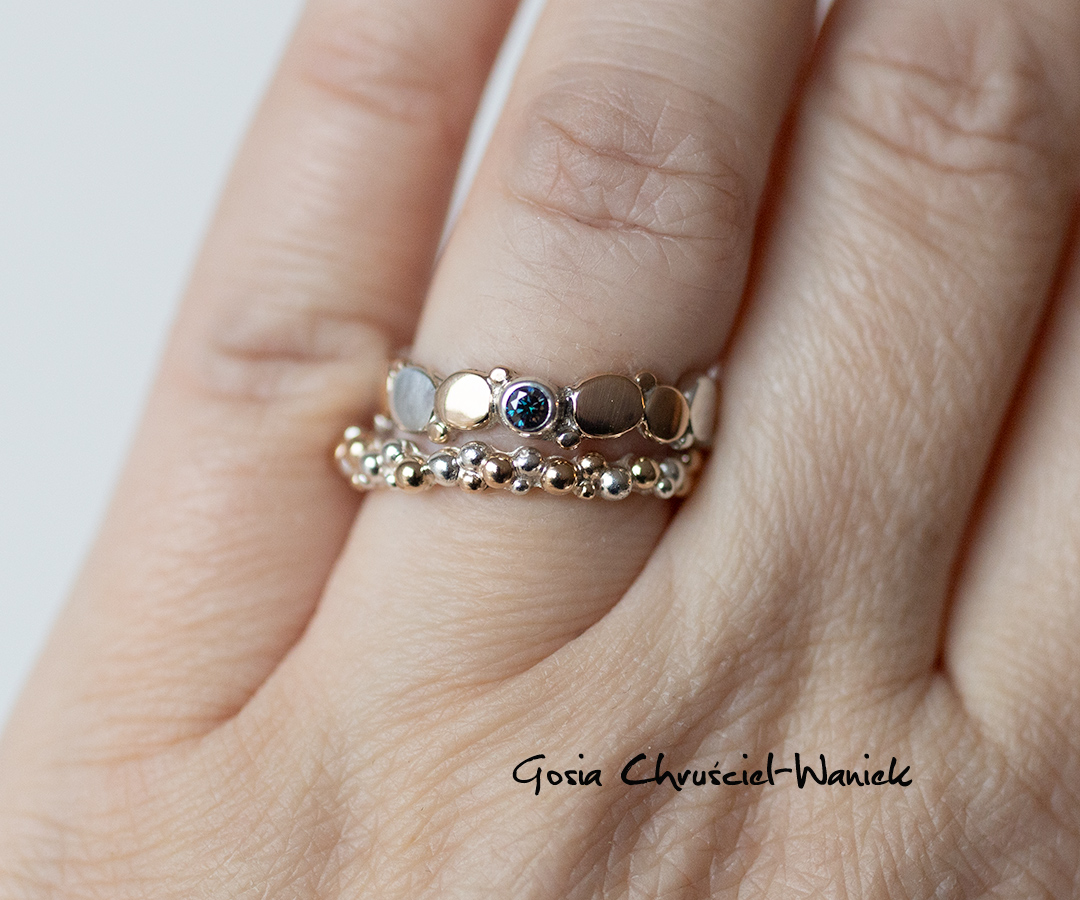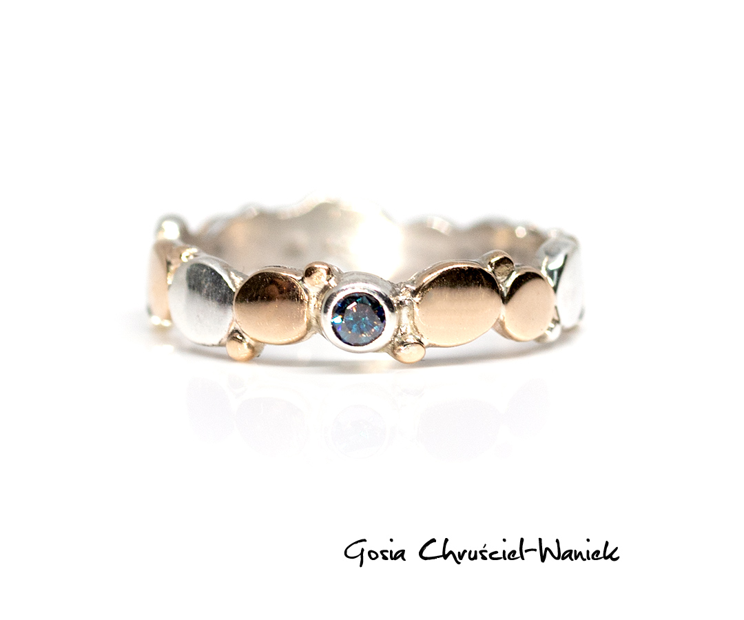 Obrączka wykonana ze srebra pr. 925 i złota pr. 585 ozdobiona grafitowym moissanitem.