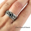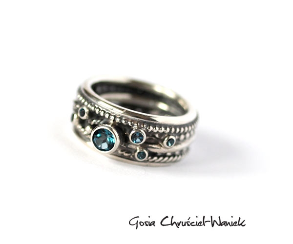 Praca na zamówienie. Masywny pierścionek wykonany ręcznie ze srebra pr 925 i 999 oraz topazów London Blue o średnicy 5mm, 2,5mm i 2mm. Rozmiar jubilerski 16. Praca oksydowana i polerowana.
