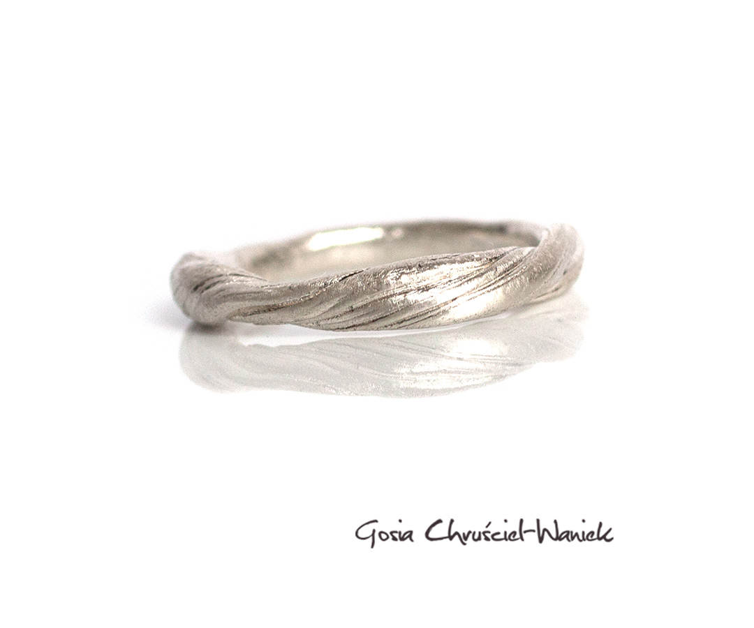 Unique to moja nowa kolekcja wyjątkowych i niepowtarzalnych pierścieni. Tworzę ją dzięki bardzo starej technice, która pochodzi z VII wiecznej Japonii. Jest to technika wosku traconego, inna niż tradycyjnie rozpowszechniona w jubilerstwie. Wymaga cierpliwości i uwagi. Wosk musi być powoli ogrzewany rękami, aby stał się plastyczny. Po ciągłym wciąganiu i składaniu wosku, mogę stworzyć piękne i unikalne organiczne wzory oraz prążkowaną fakturę. Praca z woskiem jest bardzo hipnotyzująca i wciągająca, mam nadzieję, że moją fascynację tym materiałem będą odzwierciedlały moje prace.