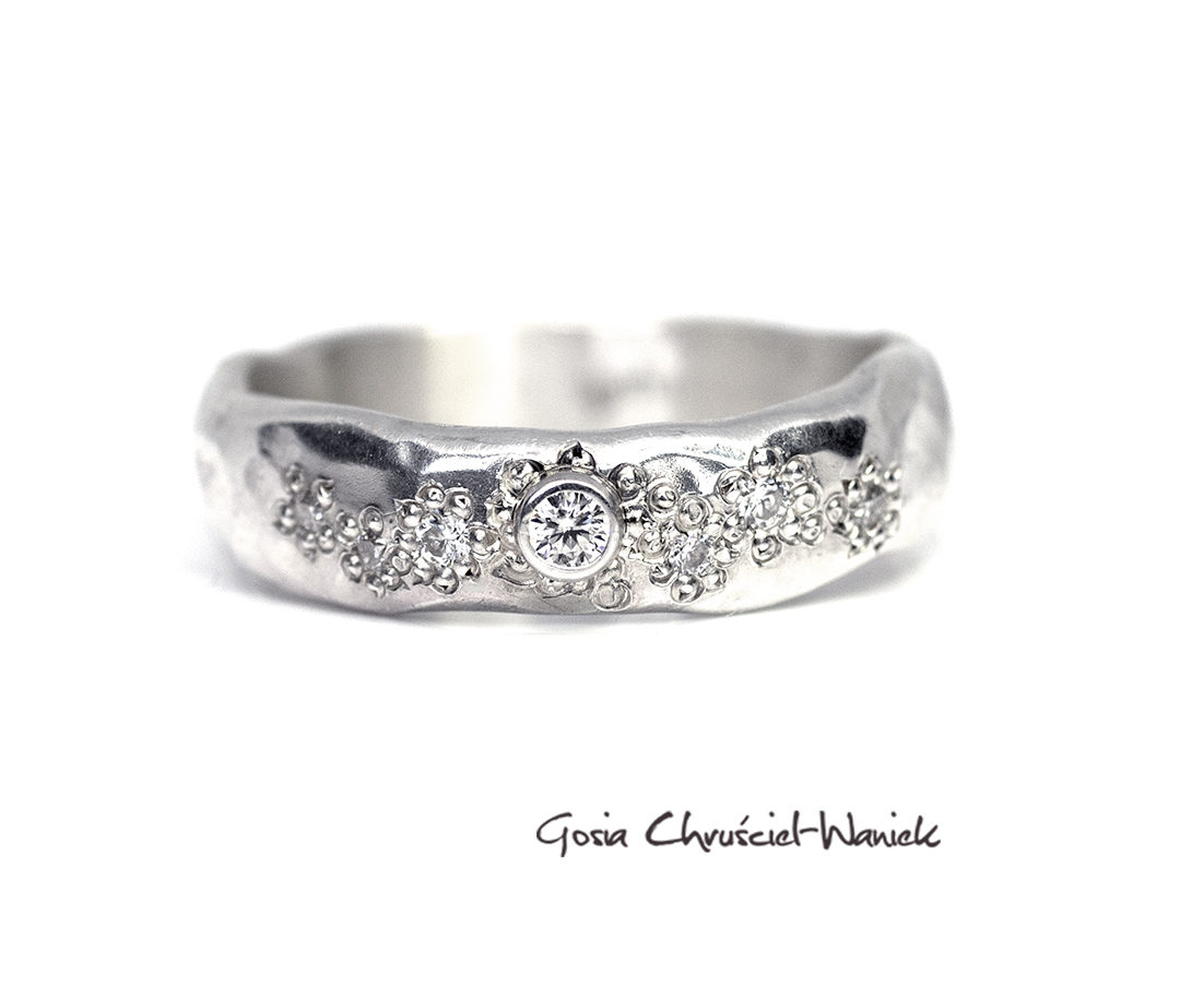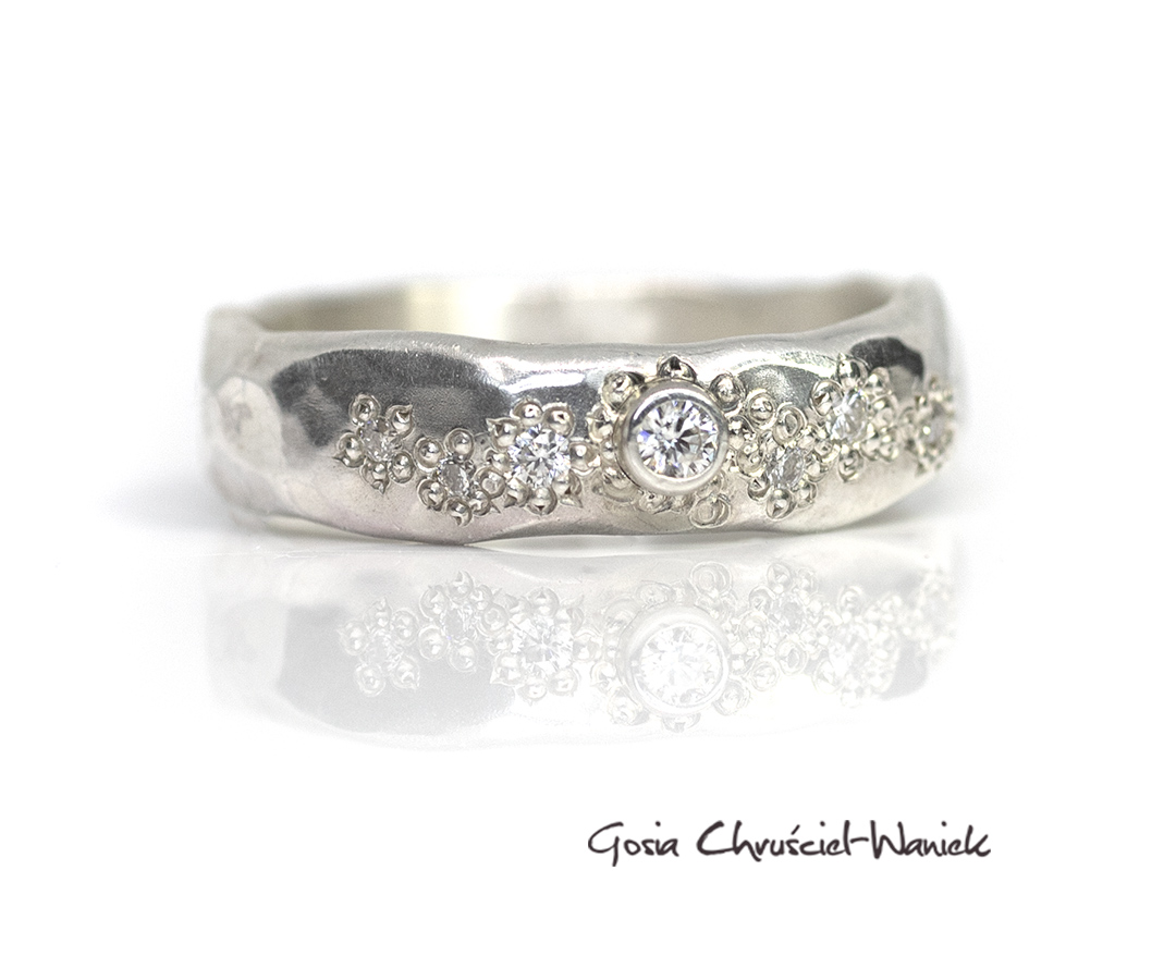Obrączka wykonana ze srebar pr. 925 z moissanitami o średnicy od 1,5mm do 2,5mm.