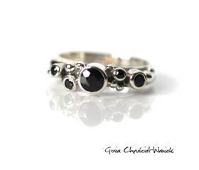 Efektowna, asymetryczna obrączka wykonana ręcznie ze srebra pr. 925 zdobioona na całym obwodzie naturalnymi czarnymi szafirami o średnicy od 2mm do 3,5mm (18 sztuk).