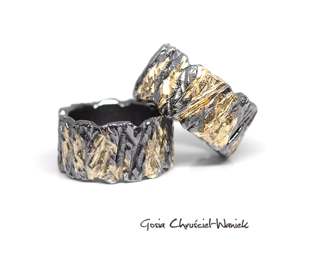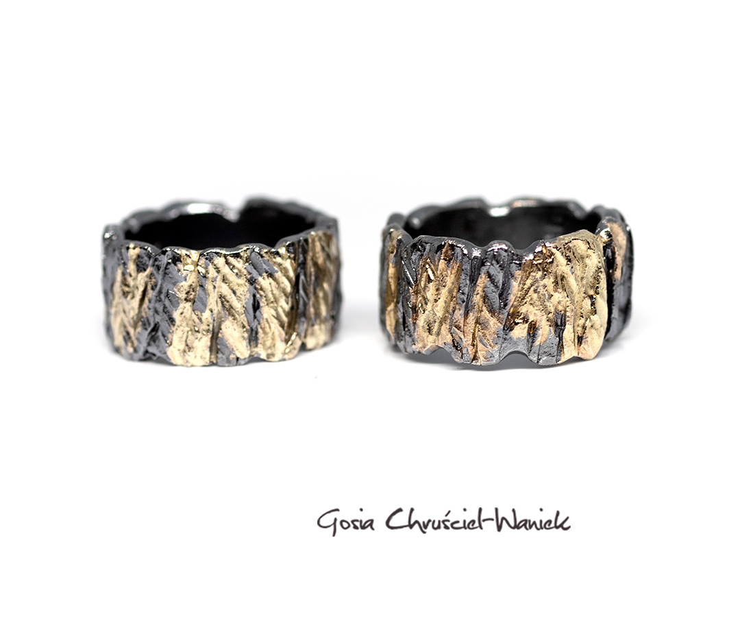 Masywne, szerokie obrączki Kora wykonane ze srebra pr. 925, zdobione złotem pr. 585.