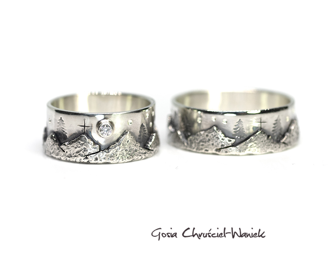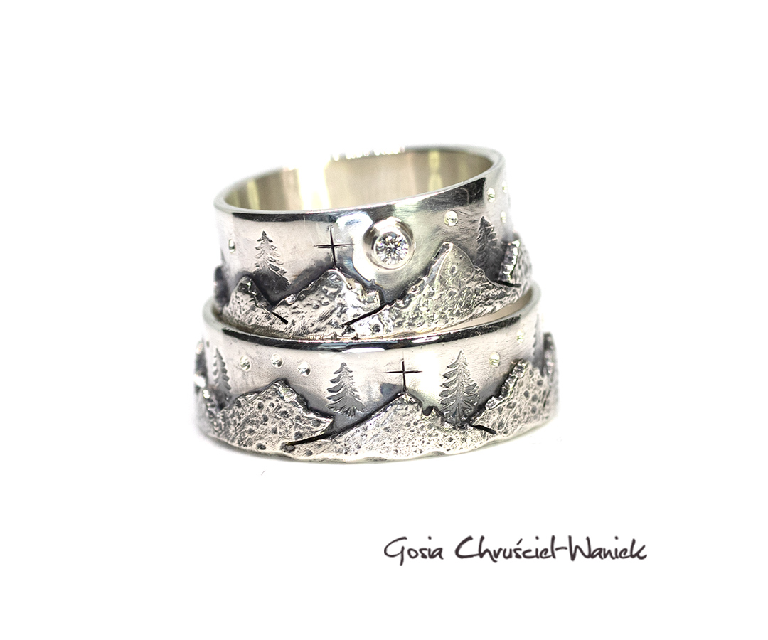 Obrączki z motywem gór, z drzewami, gwiazdami i brylantem.