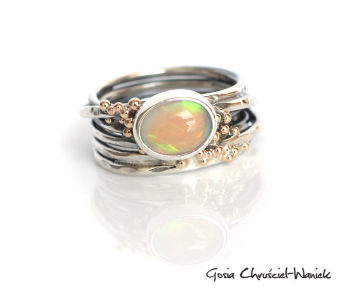 Pierścionek wykonany ze srebra pr. 925, zdobiony złotymi kuleczkami i pięknym opalem.