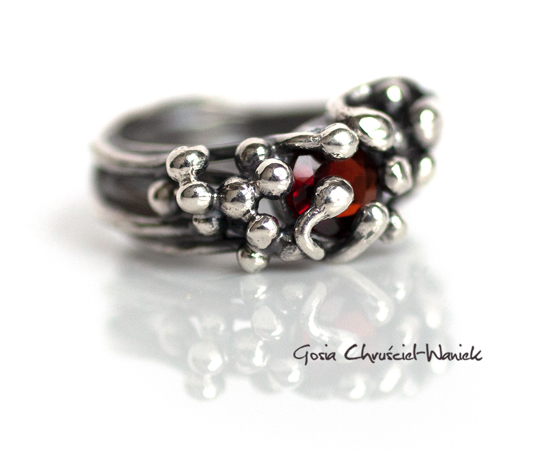 Pierścionek wykonany ręcznie ze srebra pr. 925, ozdobiony 6mm granatem.