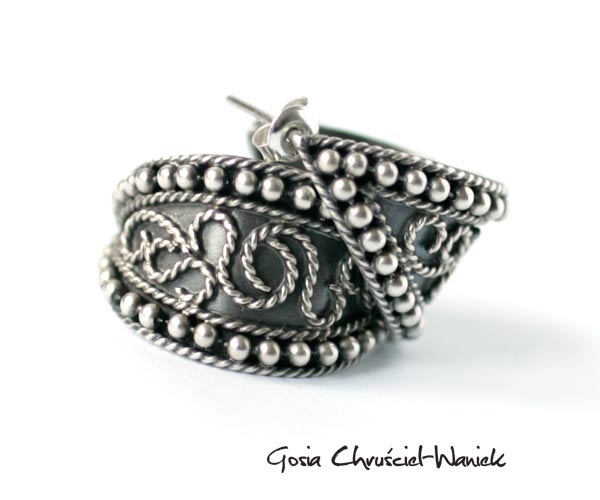 Kolczyki wykonane w całości ręcznie ze srebra pr.925 i 999. Koła zostały wyrepusowane przeze mnie i ozdobione drobnym warkoczami, ażurami i kuleczkami. Grubość sztyftów 1mm. Długość całkowita kolczyków ok 3cm. Waga pary 13,5g. Praca została zoksydowana przetarta i wypolerowana.