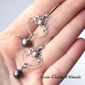 Kolczyki wykonane w całości ręcznie ze srebra pr.925 i 999. Baza kolczyków oraz bigle zostały wykonane przeze mnie i ozdobione pięknymi, okrągłymi, naturalnymi, słodkowodnymi perłami w kolorze fioletowym. Perły mają średnicę ok 9mm. Praca została zoksydowana, przetarta i wypolerowana. Waga pary 6g.