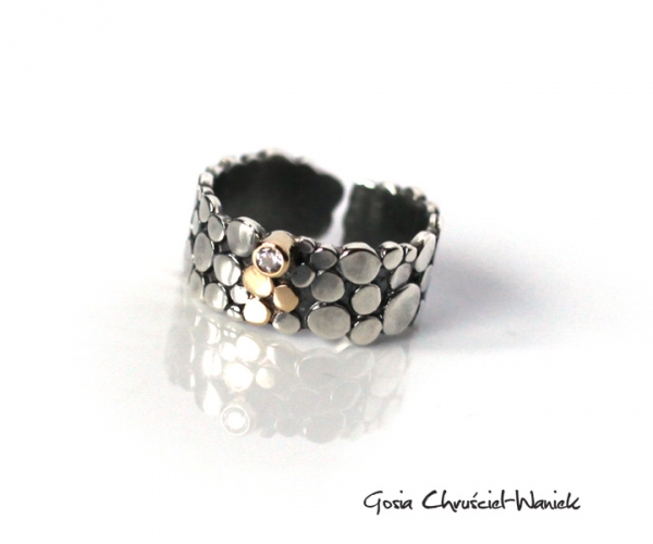 Pierścionek wykonany ręcznie ze srebra pr. 925 oraz złota pr. 585 (14K) z białą cyrkonią o średnicy 2,5mm.