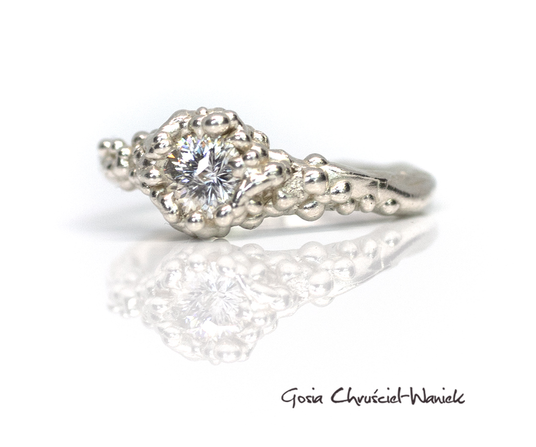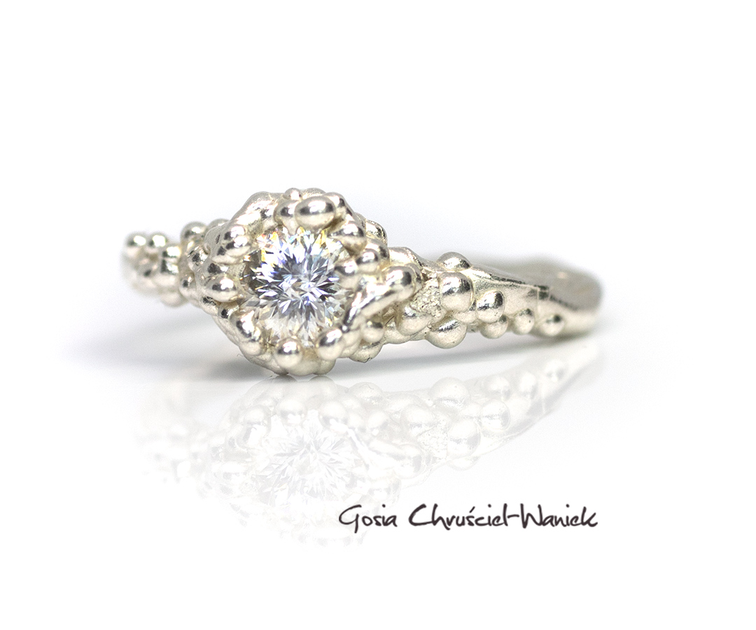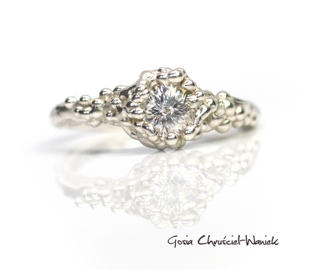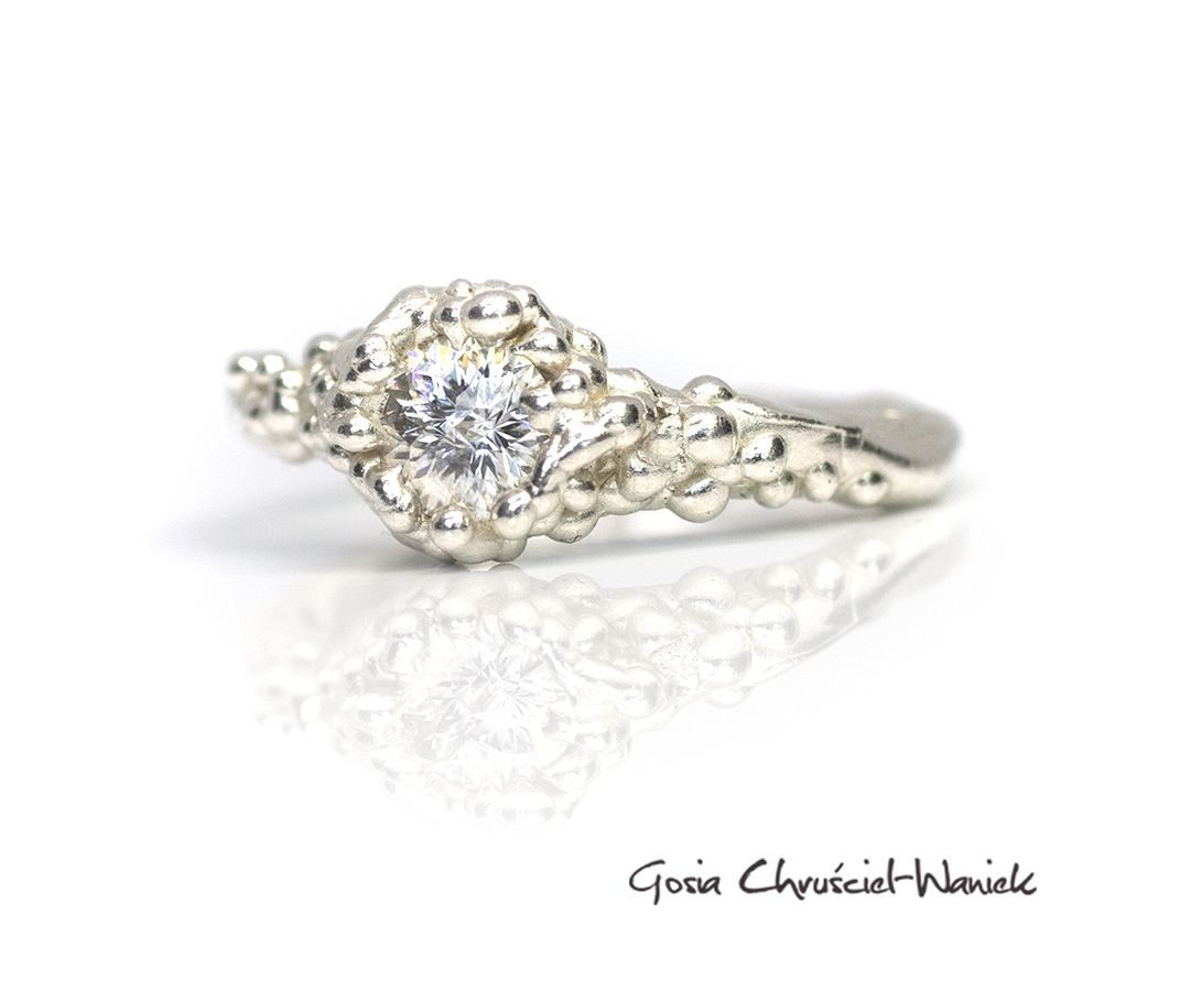 Pierścionek z kolekcji Symbiosis wykonany ze srebra pr. 925 z moissanitem o niezwykłym szlifie królewskim o średnicy 5mm (0,5ct).