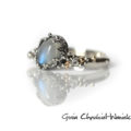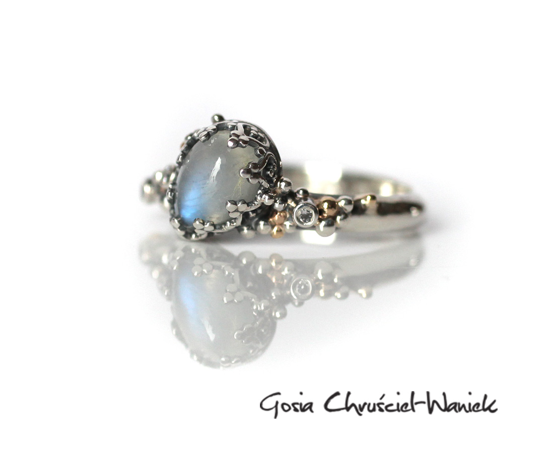 Pierścionek wykonany na zamówienie ze srebra pr. 925, złota pr. 585 z kamieniem księżycowym i cyrkoniami.