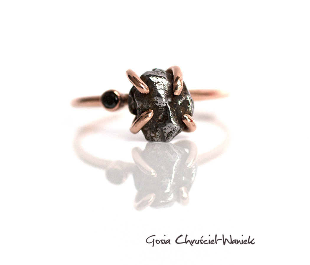 Pierścionek wykonany na zamówienie z różowego złota z meteorytem Campo del Cielo i czarnym brylantem.