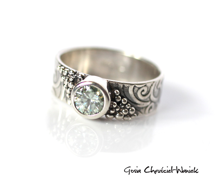 Pierścionek wykonany ręcznie ze srebra pr. 925 z moissanitem w kolorze pistacjowo-srebrzystym. Kamień ma piękny, tęczowy blask.