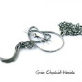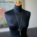 Praca na zamówienie. Niezwykły naszyjnik wykonany ze srebra pr.999 i 925. Wisior został wykonany w całości ręcznie. Kot ma długość całkowitą ok 5,5cm +łańcuszki ok 6cm. Długość całkowita wisiora wraz z krawatką ok 12cm. Kot został zawieszony na łańcuchu o długości ok 73cm (możliwość dowolnej regulacji). Praca została zoksydowana, przetarta i wypolerowana. Na ostatnim zdjęciu widać najdłuższy wariant łańcuszka.
