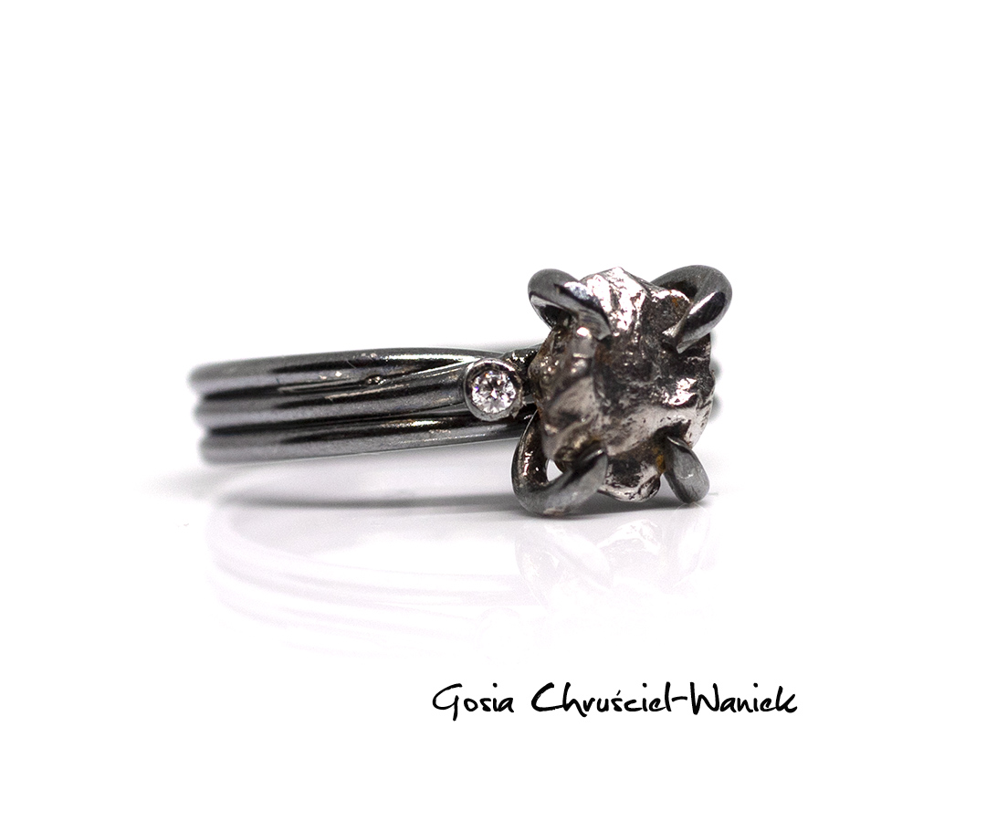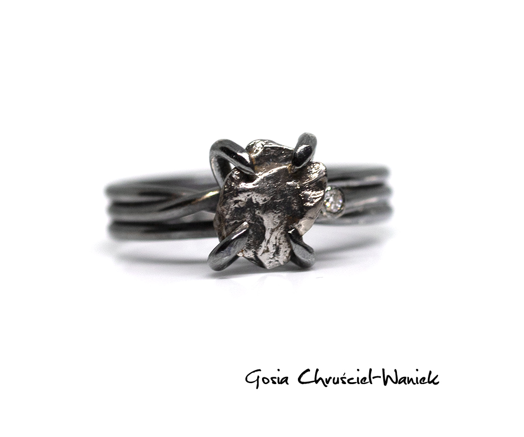 Pierścionek sprężynka z meteorytem Campo del Cielo i moissanitem.